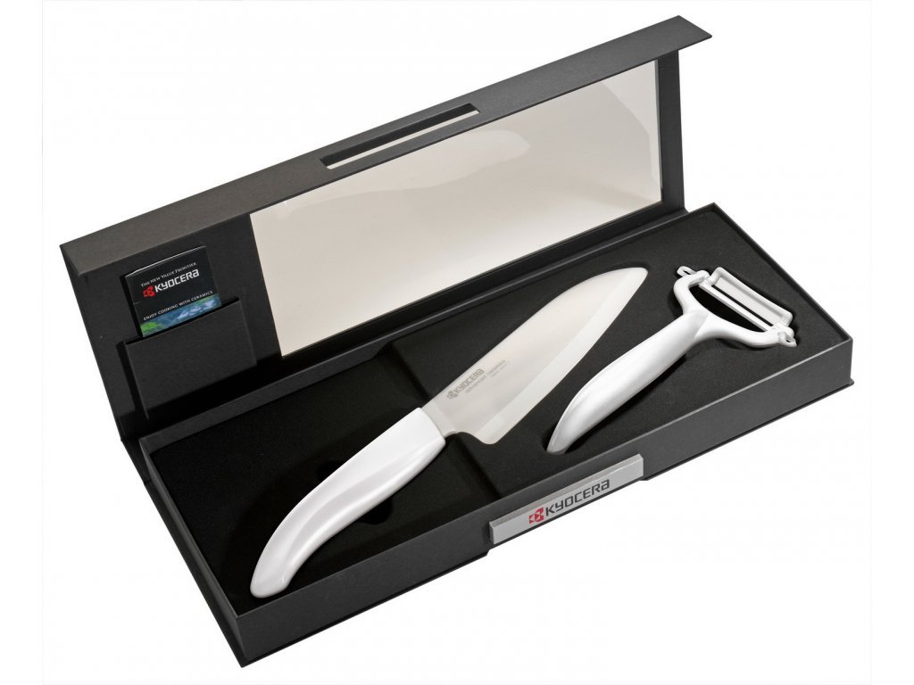 Dárková 2dílná sada Kyocera Revolution obsahuje keramický nůž Santoku 14 cm a keramickou škrabku