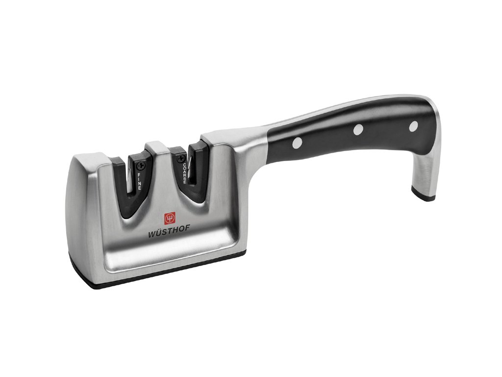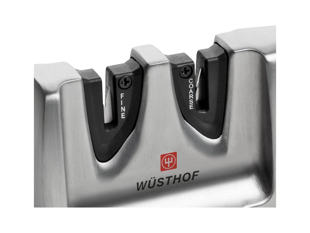- dvoustupňový ostřič nožů: první stupeň (karbid) pro hrubé broušení zostří tupé hrany / druhý stupeň (keramika) je vhodný jak pro jemné broušení v návaznosti na první stupeň, tak pro pravidelné ostření čepele