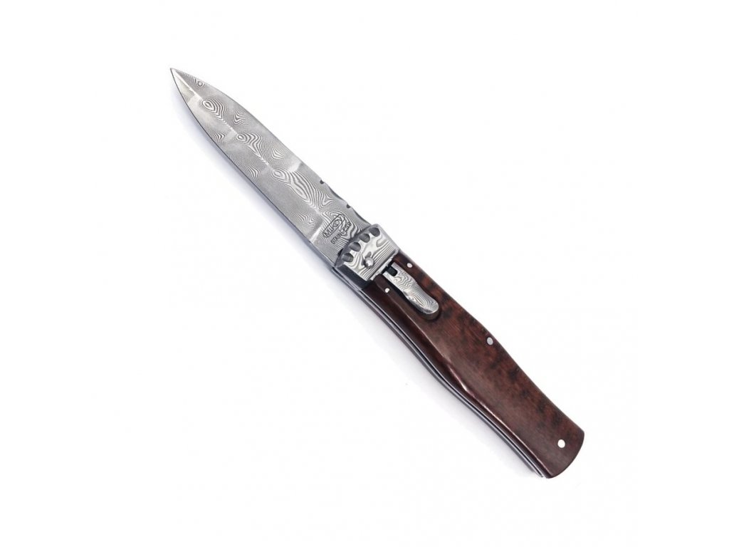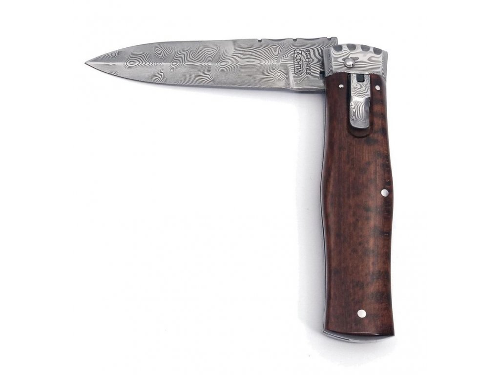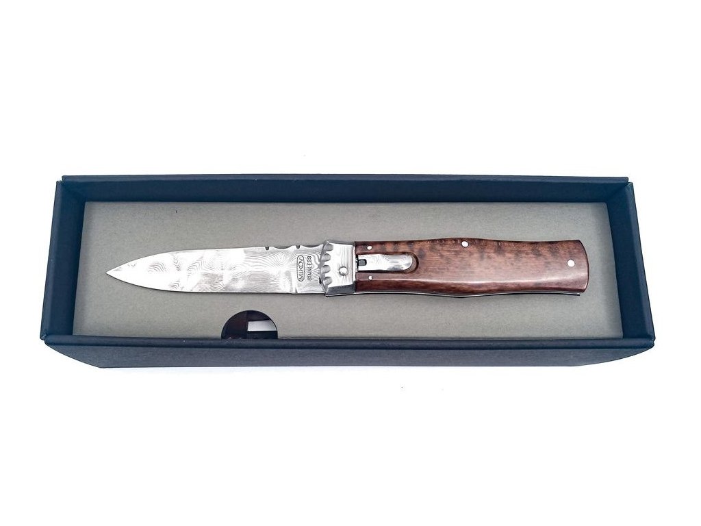 Vyhazovací nůž Mikov Predator Jaguar má všechny ocelové části vyrobené z damascenské oceli PMC 27. Střenka je vyrobena z exotického dřeva (snake wood) a má ergonomický tvar, který perfektně padne do ruky. Nůž je dodáván včetně luxusního koženého pouzdra a dárkové krabičky.
