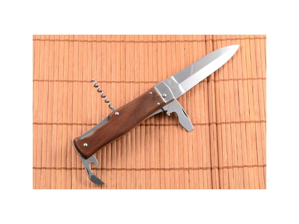 Vyhazovací nůž Mikov Predator 241-ND-4/KP má čepel vyrobenou z nerezové oceli 420. Dřevěná střenka má tvar, který perfektně padne do ruky. Nůž je dodáván včetně koženého pouzdra. Vybavení: otvírák na lahve / šroubovák / drážka na odizolování vodičů, otvírák na konzervy, vývrtka.