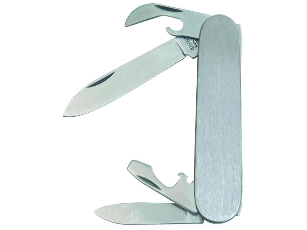 Kapesní zavírací nůž Mikov Stovka 100-NN-4 D má střenku i čepel (70 mm) z nerezové oceli. Hmotnost nože je 78 gramů. Nástroje: čepel, malá čepel, otvírák na konzervy, otvírák na lahve / šroubovák / drážka na odizolování vodičů.